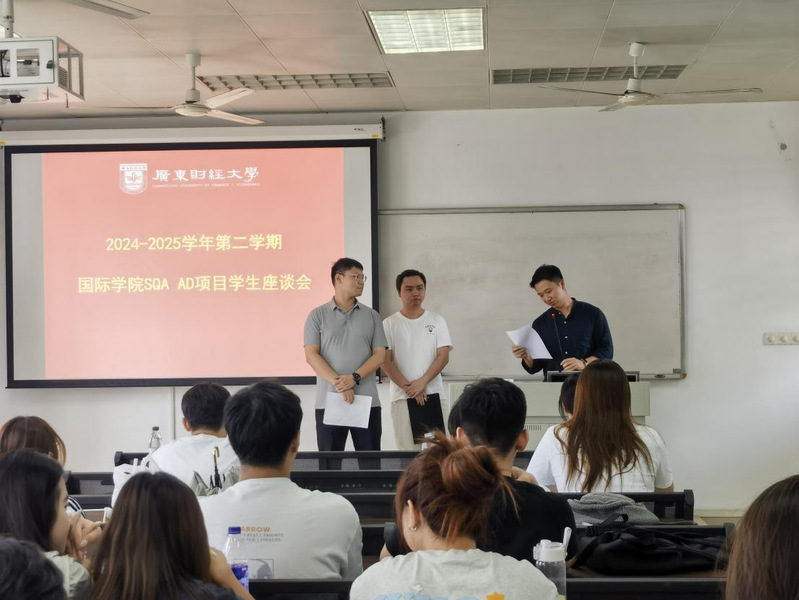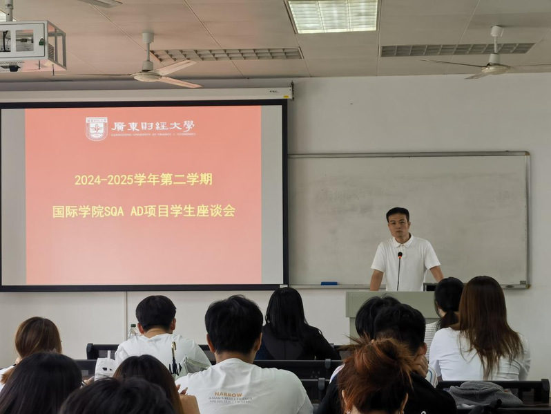 6月10日中午,taptap点点体育国际本科SQA AD项目在善学楼404教室召开2024-2025学年第二学期学生教学座谈会。taptap点点体育副院长兼SQA AD项目协调员韦娟、国际本科SQA AD中心副主任施柳锋、教学主任林骧、语言课负责人黄嘉良、专业课负责人周阳、教务与学工老师等工作人员以及各班级学生代表参加本次座谈会。会议由施柳锋主持。