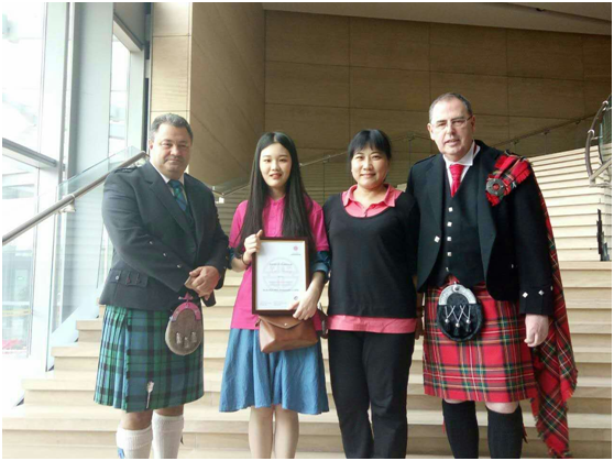 taptap点点体育张馨同学与苏格兰学历管理委员会Alistair Shaw先生(左一)、Neil MacGowan先生(右一)、taptap点点体育此次活动带队老师高老师合影