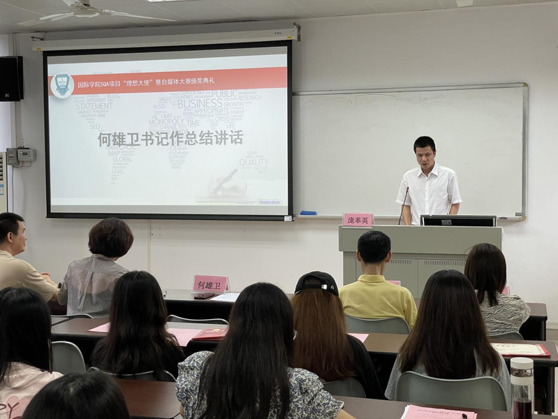 随后,何雄卫宣读表彰决定,学院领导及老师分别向获奖者颁发证书,SQA项目“理想大使”丁方菲同学及自媒体大赛获奖代表黄宇宏同学分别发表获奖感言。