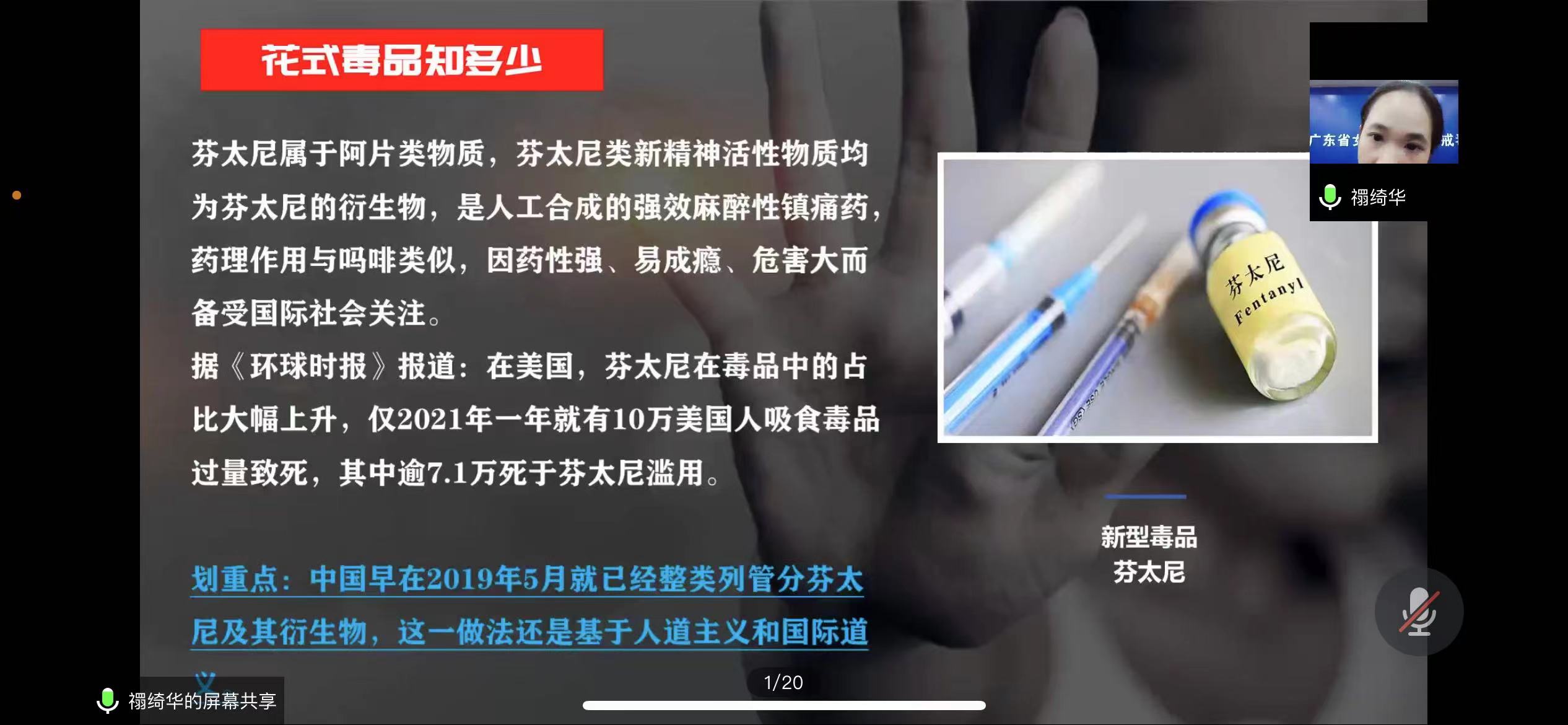 禁毒宣讲由广东省普法宣讲团团长,广东省女子强制隔离戒毒所二大队副大队长禤绮华担任主讲人。禤绮华大队长用通俗易懂的语言、生动鲜活的图文和真实典型的案例,讲解了什么是毒品、毒品的严重危害。详细解读了我国法律法规对严厉打击毒品违法犯罪的相关规定,深刻阐述了国际国内毒情形势,重点就青少年学生如何有效预防毒品侵害、自觉抵制毒品进行了深入细致地讲解,引导青少年学生积极参与禁毒斗争,进一步加强青少年认识新型毒品,拒绝毒品诱惑的自我能力,帮助学生树立起积极向上的世界观、人生观、价值观,提高了拒毒免疫力。