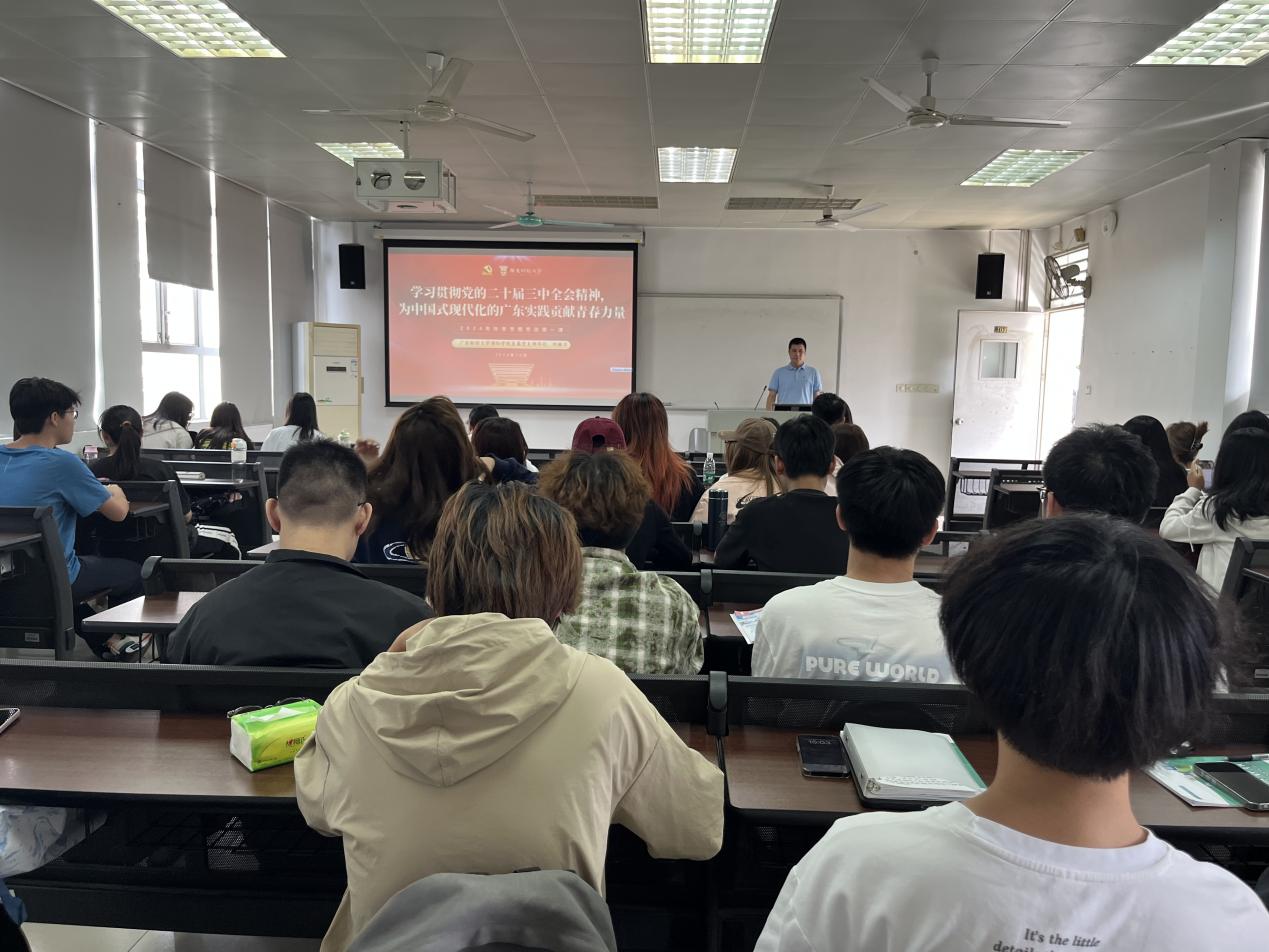 1024日下午,taptap点点体育直属党支部书记何雄卫在善学楼402课室以“学习贯彻党的二十届三中全会精神,为中国式现代化的广东实践贡献青春力量”为主题,为学院学生代表讲授思政课。